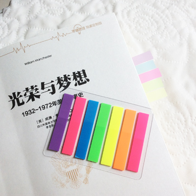 PET Sticky Tabs SN-694 SN-695: 45*7mm, 7 colors stripsColors: Purple / Rose-Red / Yellow / Green / Blue / Pink / Orange NEON COLORPackage: Shrinkwrap / OPP bag / Color box / Blister cardSheets: 20sheets X 7Feature: Removable self-stick, Strong adheasive, Writing smooth, Environmental friendly. You may also like Stick Notes SN-654N Glue PVA-21 Memo Pad LD308